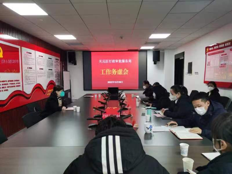 2022年12月29日上午,株洲市天元区行政审批服务局召开2022年度工作务虚会,全面盘点回顾全面以来各项工作开展情况,谋划研究明年工作。天元区人民政府副区长蔡滔出席会议并讲话,区行政审批服务局副局长(主持工作)彭亭颖主持会议,班子成员及相关股室人员参会。