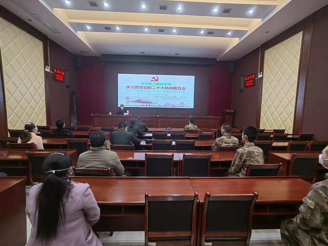 2023年1月12日,天元区委学习贯彻党的二十大精神宣讲团成员、天元区退役军人事务局党支部书记、局长张定富赴人武部、信访局作专题宣讲,围绕党的二十大主题和主要成果、过去五年工作和新时代十年伟大变革的重大意义、习近平新时代中国特色社会主义思想的世界观和方法论、以中国式现代化全面推进中华民族伟大复兴的使命任务、团结奋斗的时代要求等方面,对党的二十大精神进行了系统阐述和深入解读。