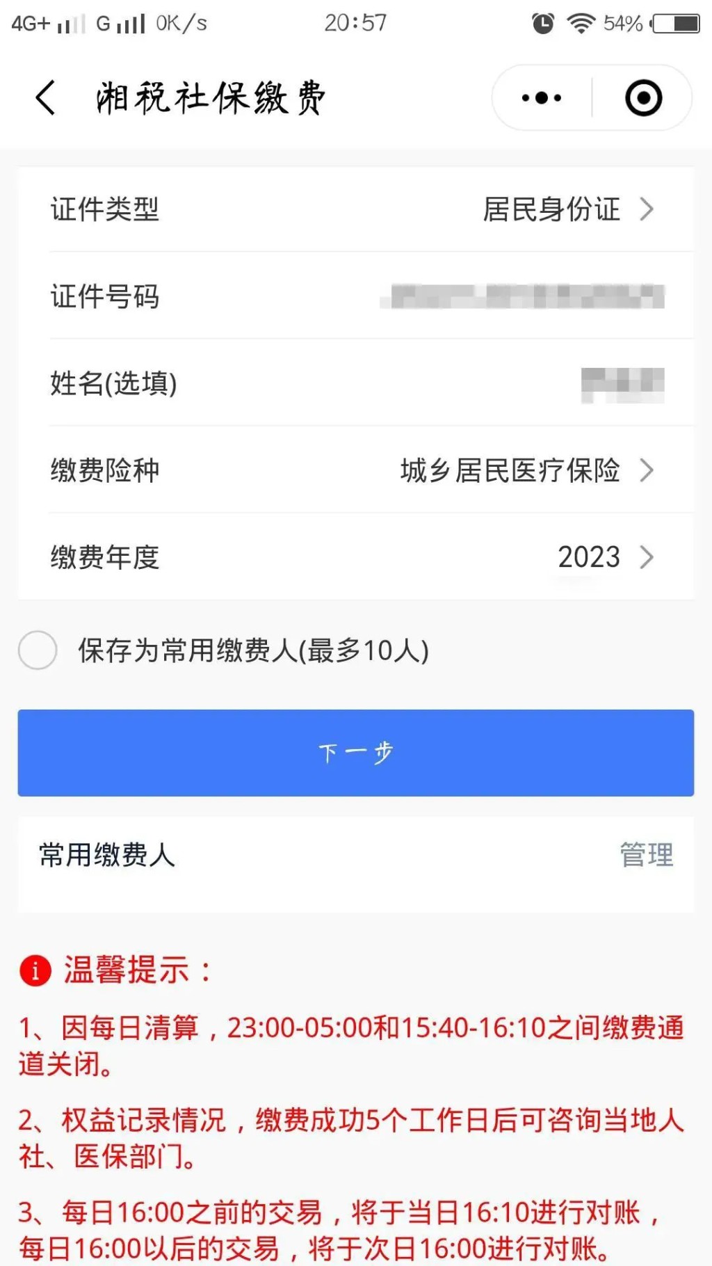 01 缴费时间 城乡居民医保集中缴费期延长至2023年2月28日。 02 缴费标准 城乡居民医保个人缴费标准统一为350元/人•年,特困人员、重度残疾人、孤儿、事实无人抚养儿童个人不缴费,低保对象、监测对象、最低生活保障边缘家庭成员个人缴费标准为175元/人•年。 03 待遇享受 2023年2月28日前,按规定参保缴纳2023年度城乡居民医保费用的,自2023年1月1日起享受2023年度城乡居民医保待遇。新入学大中专院校学生医保待遇享受期为缴费当年9月1日至次年12月31日。 04 如何参保 (1)在校学生以学校为单位整体参保登记; (2)其他城乡居民(含未参保学生)新参保,直接到户籍地或居住地街道(乡镇)、社区(村)办理; (3)港澳台居民提供居住证,外国人提供永久居留证在居住地社区办理参保。 05 缴费方法 (1)中小学生由学生(监护人)通过线上缴费,大学生由学校统一代收代缴医保费; (2)其他城乡居民通过线上缴费; (3)缴费方法:搜索或扫二维码“湘税社保”微信小程序或下载“湘税社保”APP缴费,凭身份证(或户口簿、医保手册)到市内定点银行网点或税务大厅办理缴费。 06 医疗待遇 城乡居民基本医保年度内统筹基金累计最高报销限额15万元,大病保险累计最高补偿额40万元,合计55万元;市内住院政策范围内分级报销比例为60%~85%;基层医疗机构门诊统筹报销比例70%,年度内累计最高报销金额420元;高血压、糖尿病门诊用药专项保障,报销比例70%,年度内累计最高报销金额分别为360元和600元。 07 咨询电话 株洲市医疗保障局:28681499 株洲市天元区税务局:22760385 天元区医疗保障局:28665721 28665722 28665035 28665036 28665557
