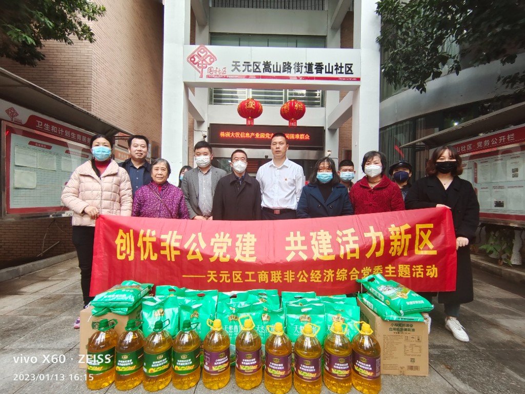 1月13日下午,天元区非公综合党委组织开展节前慰问活动,为栗雨街道中路社区防止返贫户、栗雨街道香山社区困难群众送去了慰问金和慰问品及新春的祝福。