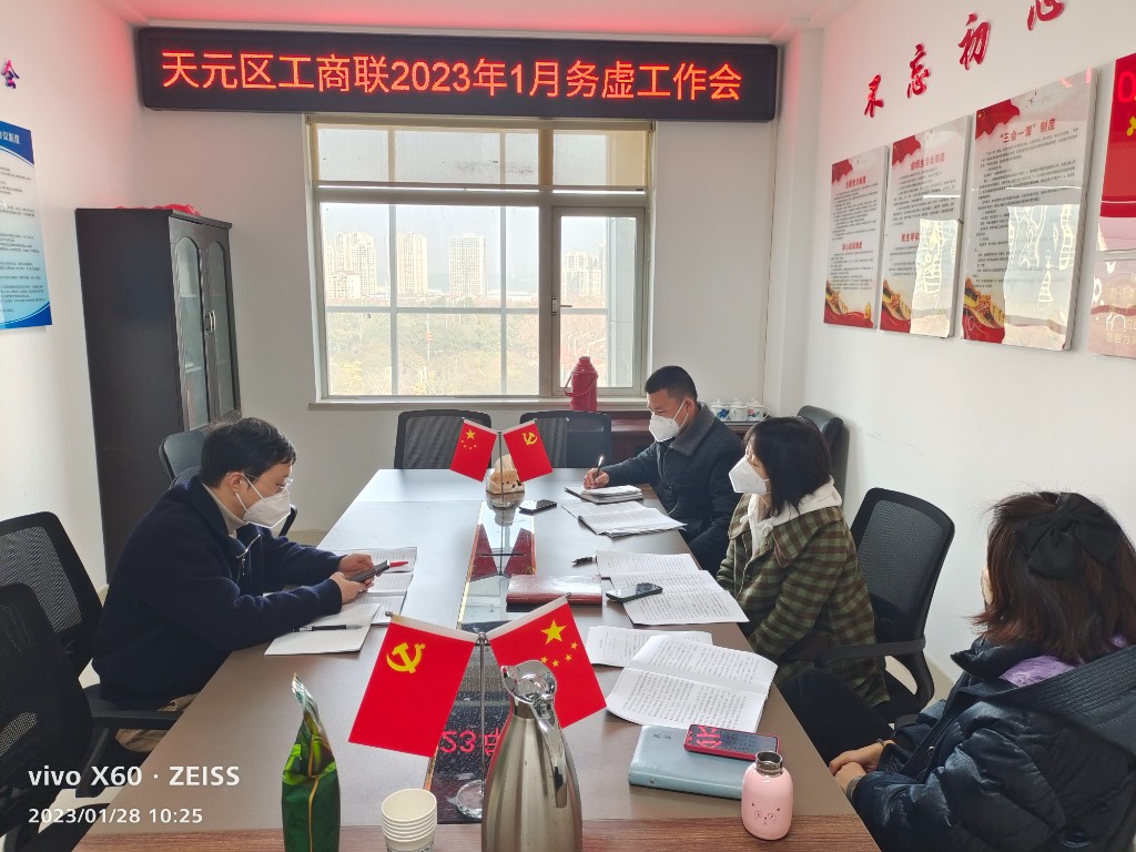 1月28日天元区工商联召开2023年1月务虚工作会议,工商联党组书记邬海涛、工商联主席吴琼瑛、工商联党组成员、副主席陈绪军、办公室主任梁坤参加。会议重点研究省政府工作报告,结合市委提出的“项目攻坚年”和“作风建设年”,以及上级特别关注的事项,认真思考2023年本系统、本单位可以重点推进的工作。
