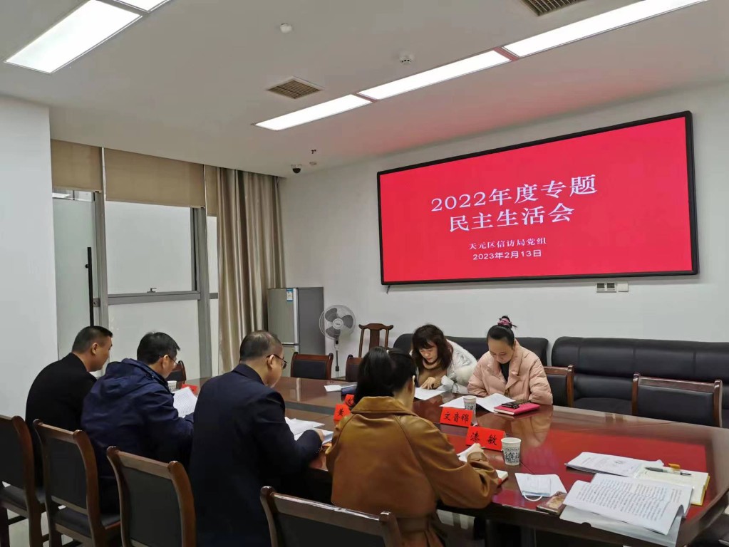 2月13日上午,天元区信访局党组召开2022年度专题民主生活会。区委指导组组长申莉萍到会指导,区信访局党组书记黄亮主持会议,派驻纪检组组长文音锦及全体班子成员参加会议。