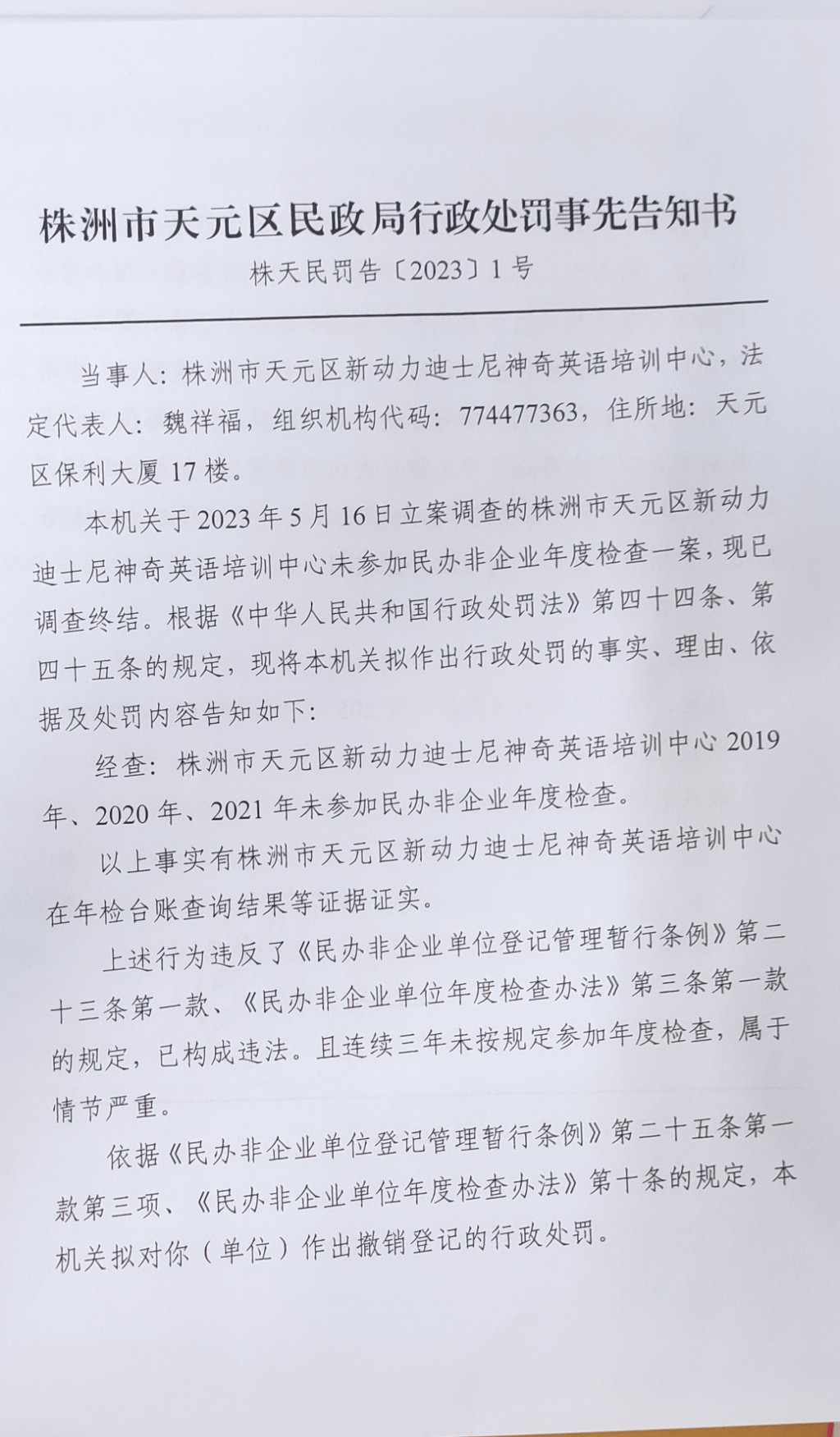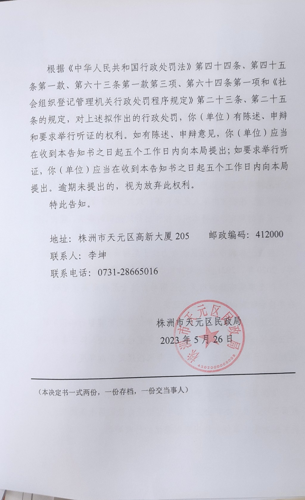 株洲市天元区民政局行政处罚事先告知书(株天民罚告〔2023〕1号)