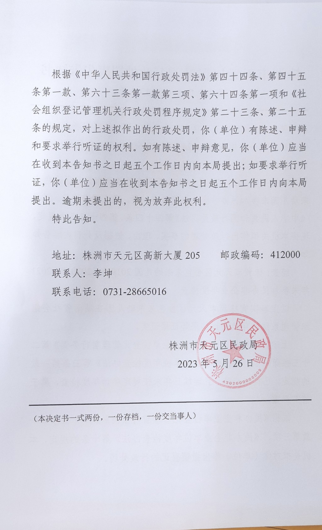 株洲市天元区民政局行政处罚事先告知书(株天民罚告〔2023〕3号)