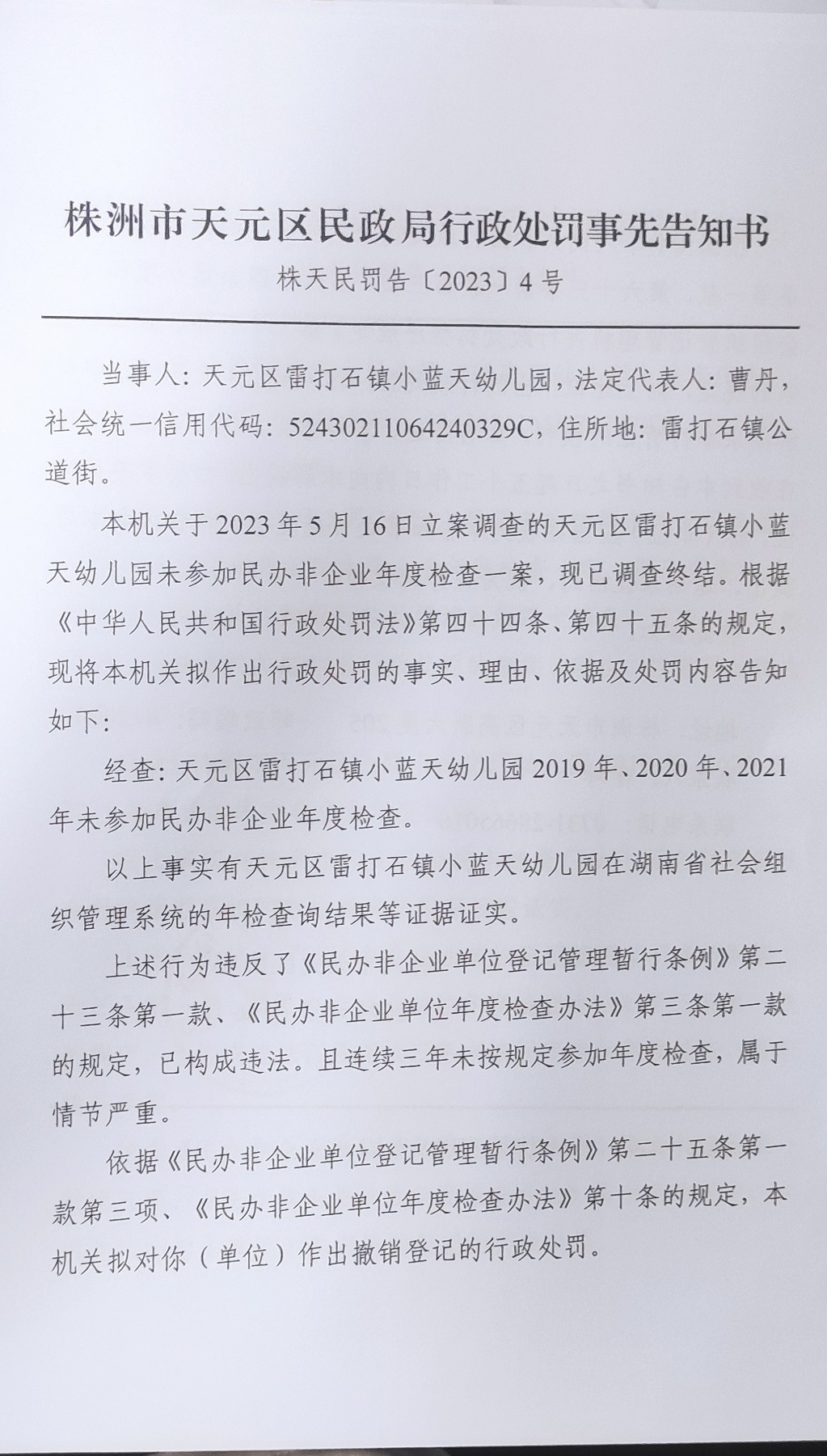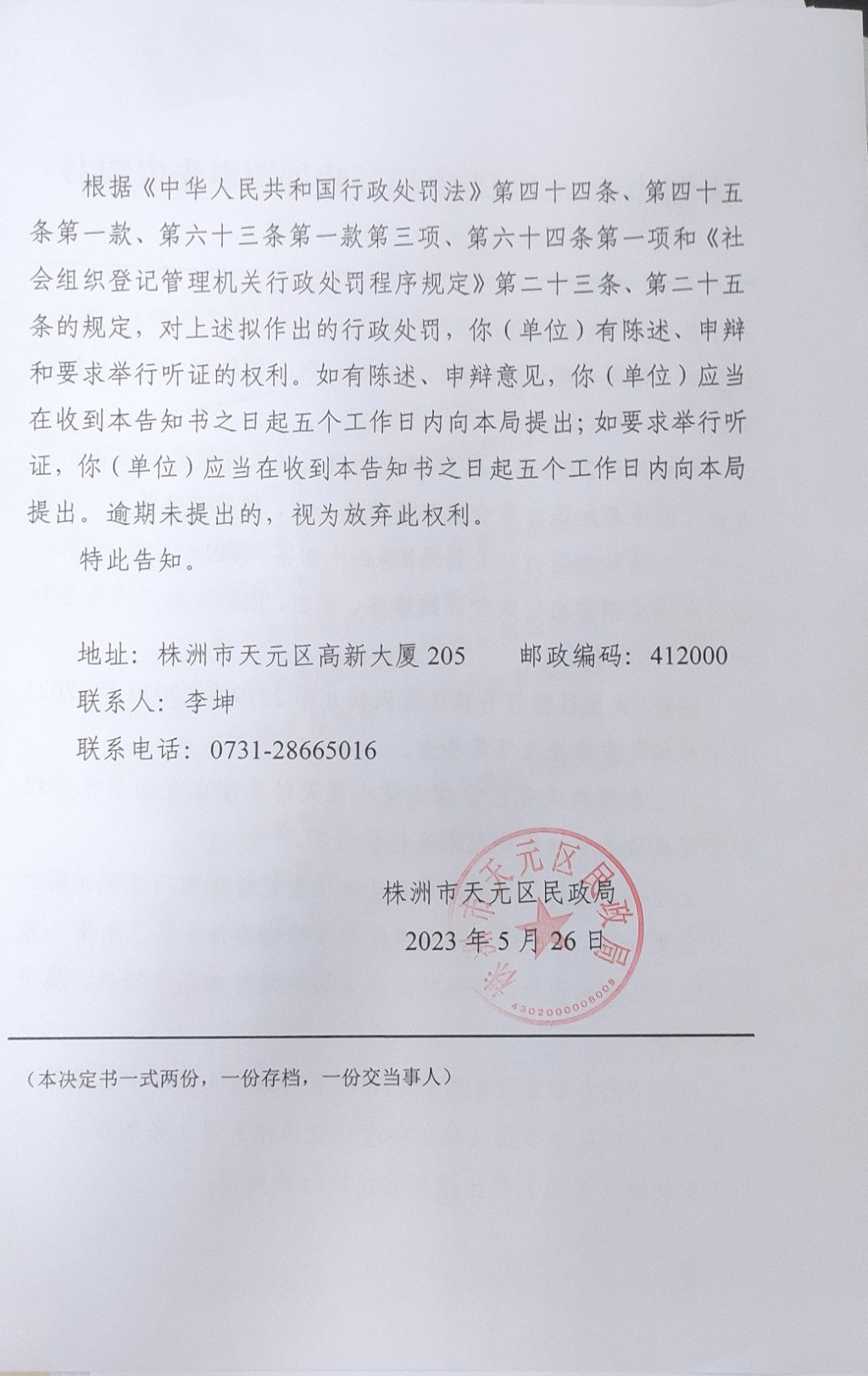 株洲市天元区民政局行政处罚事先告知书(株天民罚告〔2023〕4号)