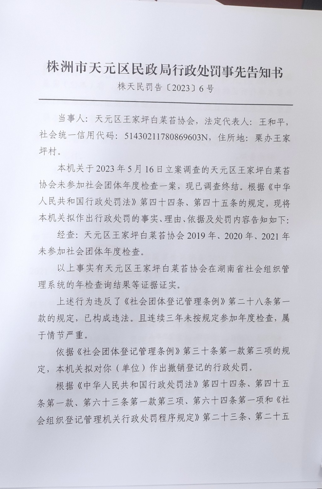 株洲市天元区民政局行政处罚事先告知书(株天民罚告〔2023〕6号)
