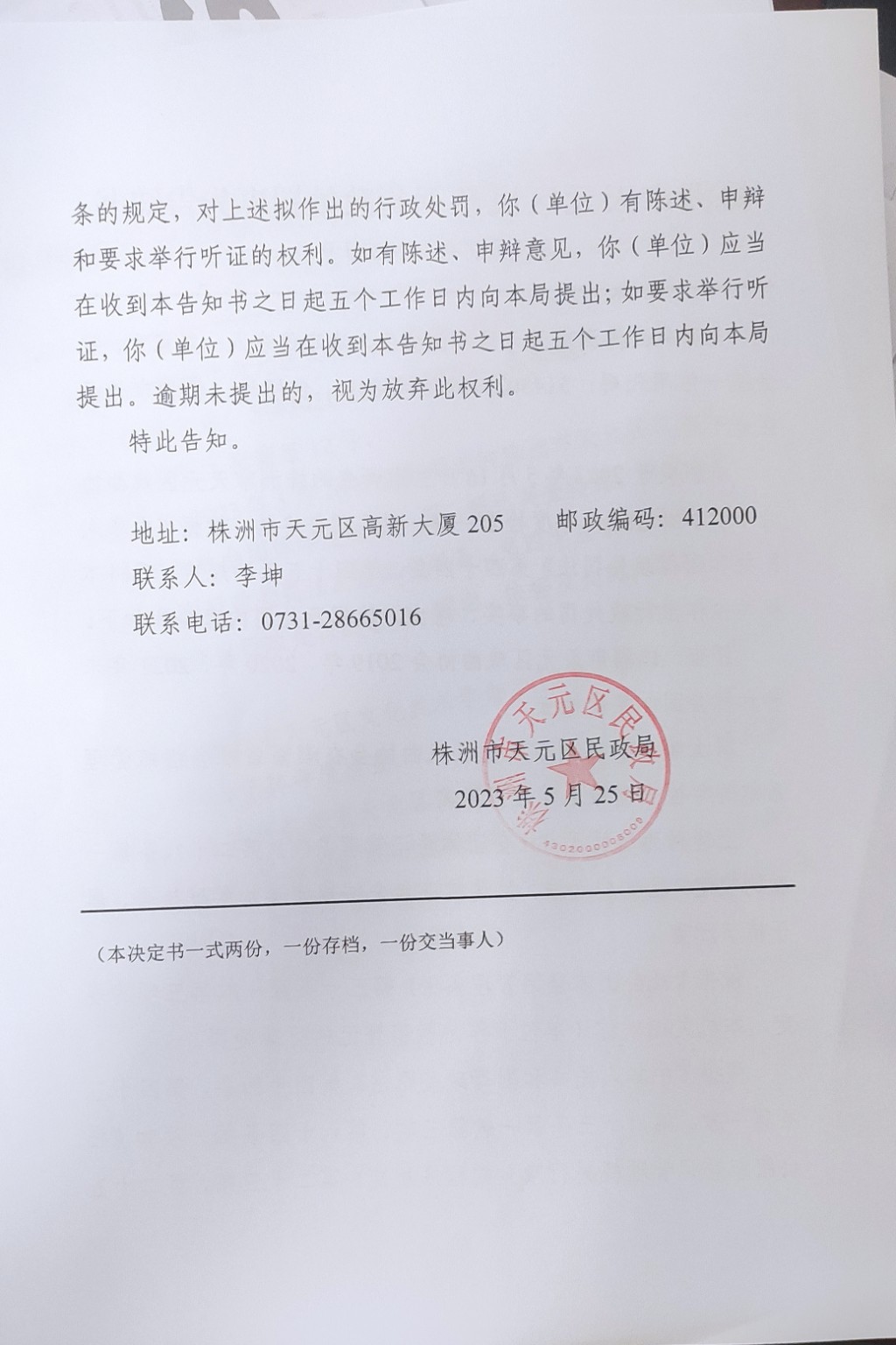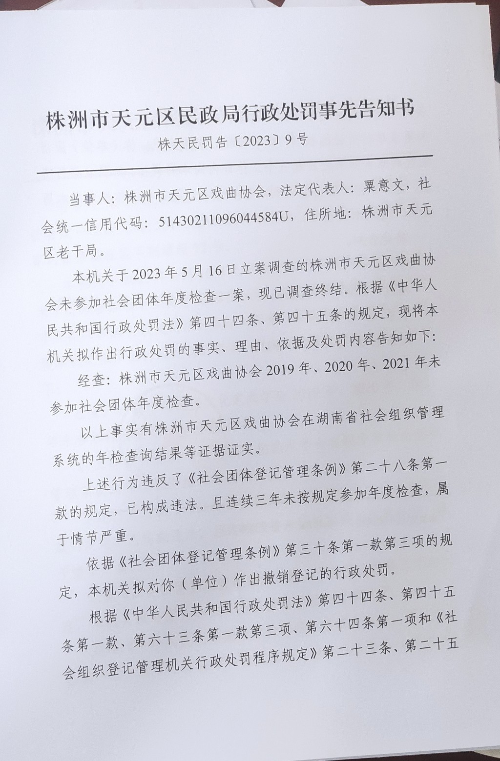 株洲市天元区民政局行政处罚事先告知书(株天民罚告〔2023〕9号)