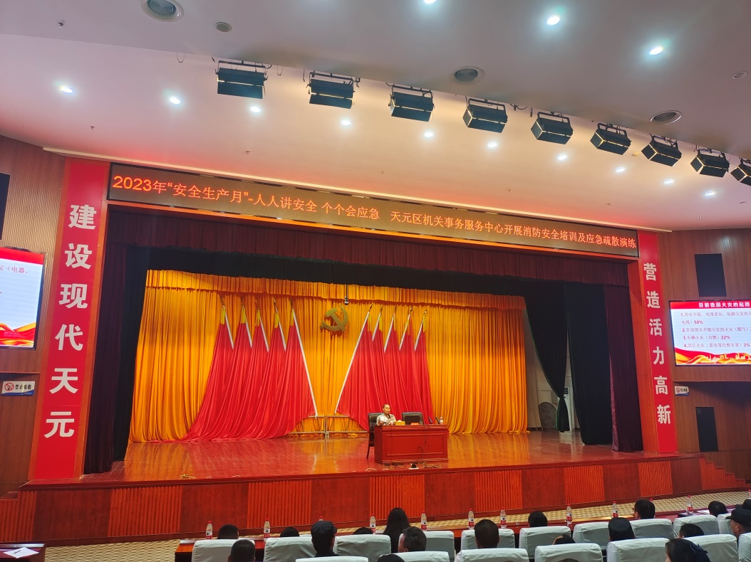 今年6月是全国第22个"安全生产月",主题是"人人讲安全 个个会应急"。为切实做好当前安全生产工作,增强抵御突发事故、事件的能力,提高全体人员的消防安全意识和消防技能, 6月9日上午9:00,天元区机关事务服务中心在高新大厦会议中心大会议室组织开展消防安全培训, 全体干部职工、三平台主管及工作人员参加培训。