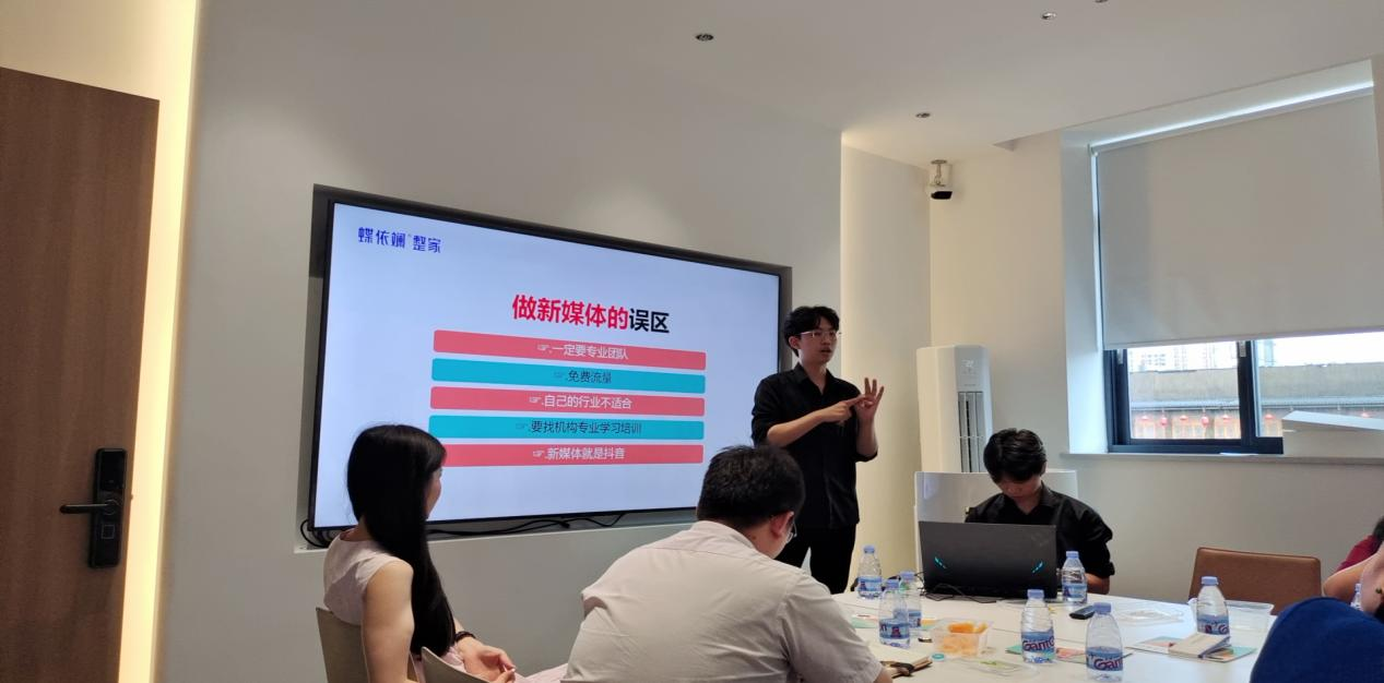 期间,董事长周石旺现场演示蝶依斓魔法家居“元宇宙整家”,公司新媒体项目负责人周子晗分享新媒体运营经验,公司设计总监进行了家居软装案例介绍。
