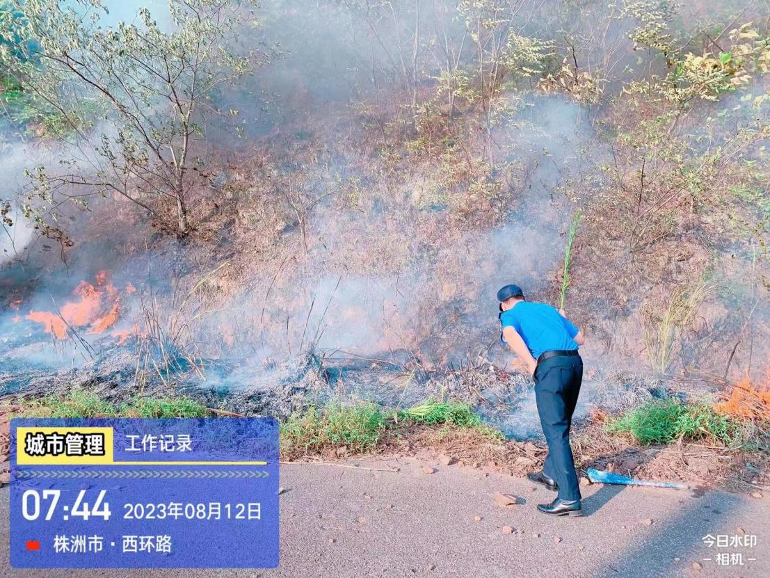 8月12日上午,城管队员在日常巡查时,发现西环线出现焚烧现象,现场烟雾缭绕、浓烟四起,且周边均为树木,有引发火灾的风险。对此城管队员立即行动,同周边群众一起控制火势,并及时联系消防部门,最终有效消除了安全隐患。