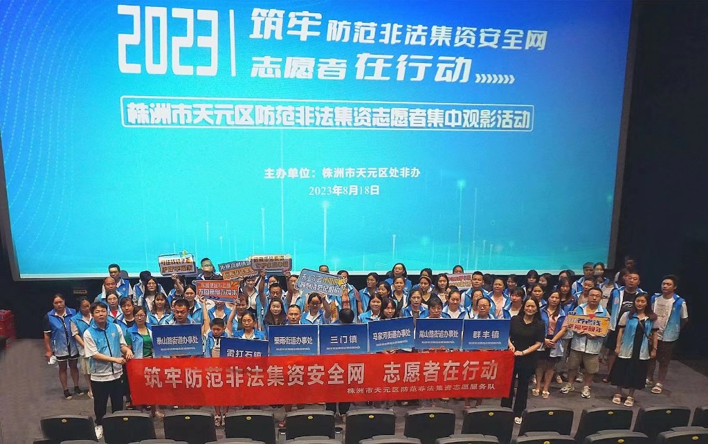 8月18日株洲市天元区邀请了辖区110余名防范非法集资志愿者走进影院,集中观看《孤注一掷》,希望通过观影提升大家的防骗意识,引导群众捂好自己的“钱袋子”,提升志愿者们在防非处非监测预警、宣传教育方面的作用。