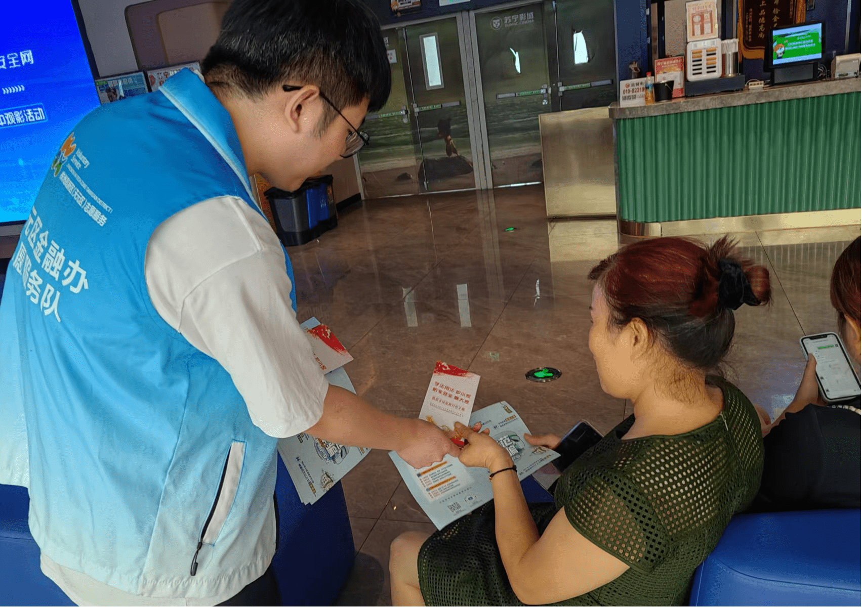 影片放映前,志愿者们踊跃上台围绕“守护百姓钱袋子”这一主题,交流分享自己在日常开展防非志愿服务中的小故事。集中观影后,志愿者们在电影院设置了防非反诈展台,通过向前来观影的群众发放宣传材料,讲解身边案例,深入揭露非法集资及电信网络诈骗犯罪分子惯用伎俩和最新手法手段等方式,提醒大家守好自己的“钱袋子”。