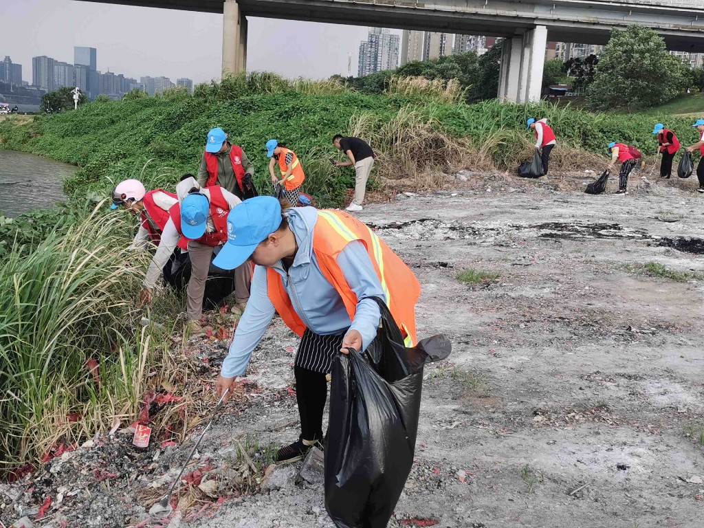 活动现场,志愿者们手持铁钳、垃圾袋,仔细捡拾河滩上的塑料袋、烟头和祭祀垃圾等,并将垃圾进行分类、集中装袋、转运。