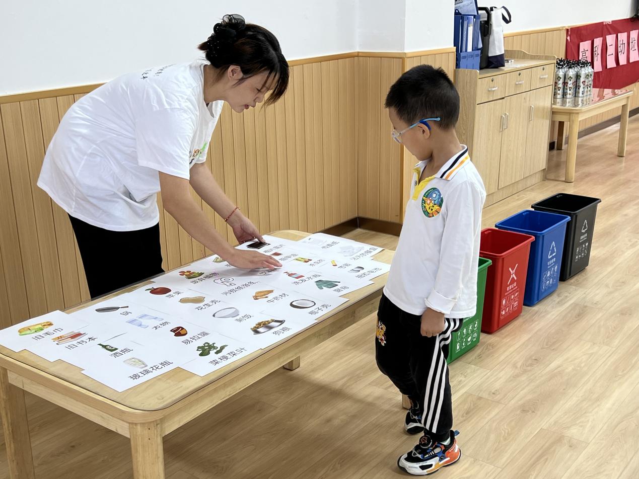 课后,为了让小朋友们进一步加深和巩固垃圾分类知识,设置玩游戏(掷骰子)的方式体验垃圾分类的乐趣。游戏中,小朋友们将骰子抛出去,按照投掷出来显示的四类垃圾标识选择相对应的卡片然后投放至相对应的四类垃圾桶内。投放正确的及时给予肯定,投放错误的第一时间进行纠正,并告知小朋友们它们属于什么垃圾。小朋友们一个个玩得不亦乐乎。
