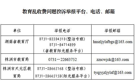 为持续推进教育乱收费问题专项整治工作,维护我校学生家长合法权益,现公开教育乱收费问题线索投诉举报平台、电话、邮箱、信件等(详见下表)。投诉举报尽可能做到事实清楚(包括时间、具体问题等)、佐证充分,提倡实名举报。投诉举报电话受理时间为工作日上班时段。来信请寄:湖南省株洲市天元区株洲大道北1号天元区人民政府,邮编:412007。