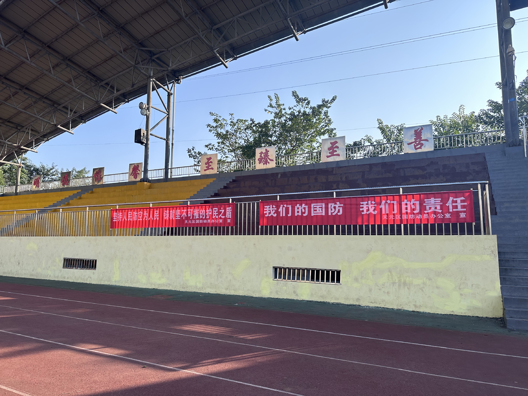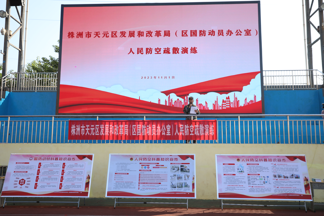 2023年11月1日,株洲市天元区国动办开展防空警报试鸣日宣传活动,向学校全体师生展示宣传展板和横幅