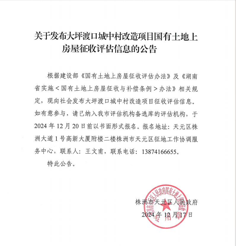关于发布大坪渡口城中村改造项目国有土地上房屋征收评估信息的公告